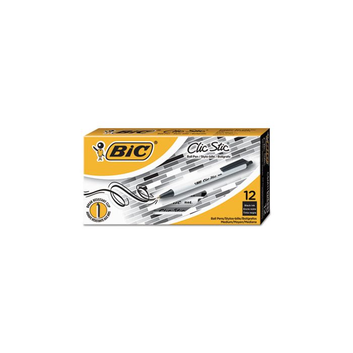 BIC® Clic Stic Ballpoint Pen, Retractable, Medium 1 mm, Black Ink, White Barrel, Dozen