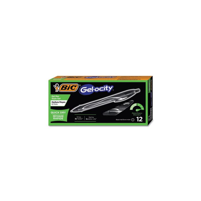Bic® Gel-ocity Quick Dry Gel Pen, Retractable, Medium 0.7 mm, Black Ink, Black Barrel, Dozen