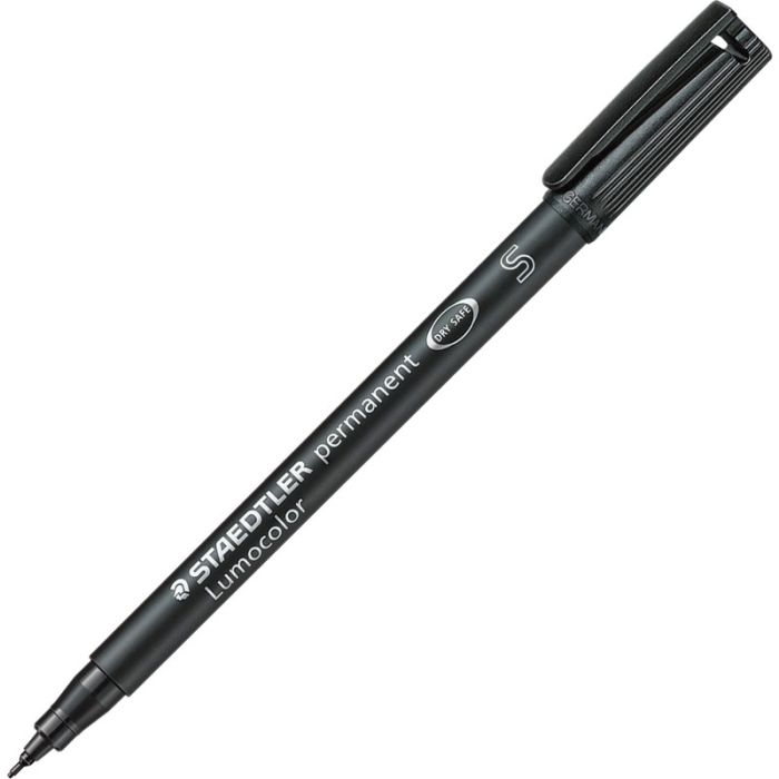 Permanent universal pen is designed for use on overhead film and almost all surfaces. Dry-Safe ink can be left uncapped for days without drying up. Low-odor ink offers excellent smudgeproof and waterproof qualities on almost all surfaces. Ink dries in seconds so ideal for left-handed users. Pen has a polypropylene barrel and cap with clip. Easy to refill.