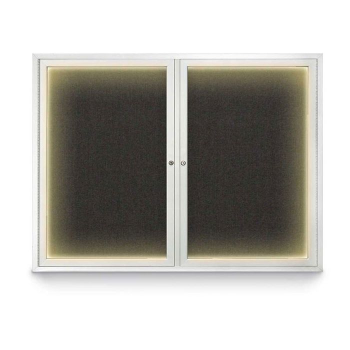 48" X 36" Double Door Traditional Indoor with Illumination Enclosed Corkboard with Black Fabric Backing Board, & Satin Anodized Aluminum Frame