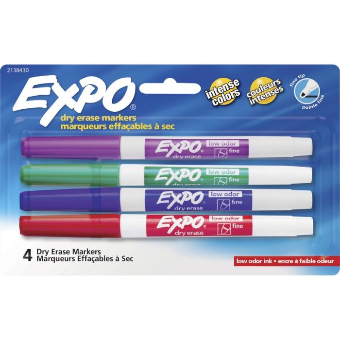 EXPO Low-Odor Dry-Erase Markers offer the best solution for marking on whiteboards and most nonporous surfaces. These dry-erase markers use a specially formulated, alcohol-based ink with virtually no odor. They feature vivid, quick-drying ink that is easy to see from a distance and a fine tip that creates detailed lines. Dry-erase marker ink erases cleanly and easily from whiteboards and most nonporous surfaces with a dry cloth or eraser. Use your EXPO Dry-Erase Markers to track, schedule and present.