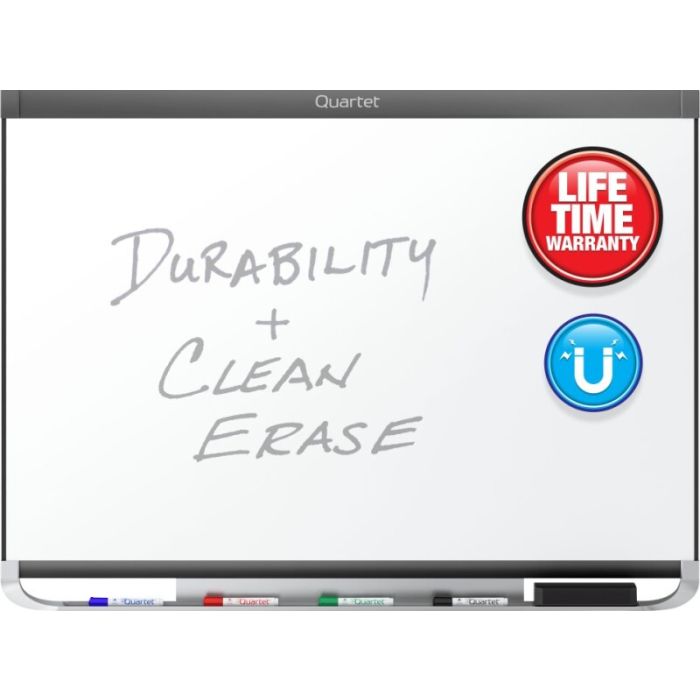 The Quartet Prestige 2 DuraMax Porcelain Magnetic Whiteboard offers a durable, smooth writing surface that resists ghosting, staining, scratching and denting, ensuring long-lasting use. Featuring a magnetic white porcelain surface and a stylish graphite metal frame with an attached full-length marker tray, it combines functionality with sleek design. Ideal for busy offices and public spaces requiring a reliable, easy-to-mount presentation board.