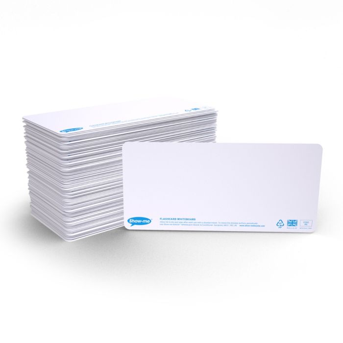 High quality drywipe flashcards designed for effective revision and clear display of single words or calculations. Each set includes the popular Show-me Medium tip marker, Mini Foam Eraser, and a refillable bottle of Show-me Whiteboard Cleaner for convenient maintenance.