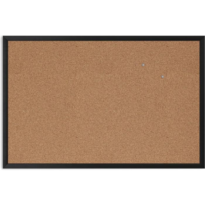 This modern black finish frame cork board is a perfect and functional solution to pin your notes and messages in any office, home or commercial environment. Use any push pins, thumb tacks or map pins to pin all of your notes, messages, pictures, memos, calendars, menus, reminders and more. Due to the dense board backing material under the board's cork surface, your push pins are firmly gripped and stay in place without falling out. The natural, self-healing cork surface hides push pin holes once the push pins are taken out. This bulletin board has a universal mounting system, as it can be hung vertically or horizontally to fit your allocated space. Mounting hardware and instructions are included for quick and easy mounting. The board is packaged with extra supportive corrugate material that is highly resistant to damage during shipping; all corrugated material can be recycled once unpacked. Board Type: Bulletin; Board Width: 48"; Board Height: 36"; Surface Material: Cork.