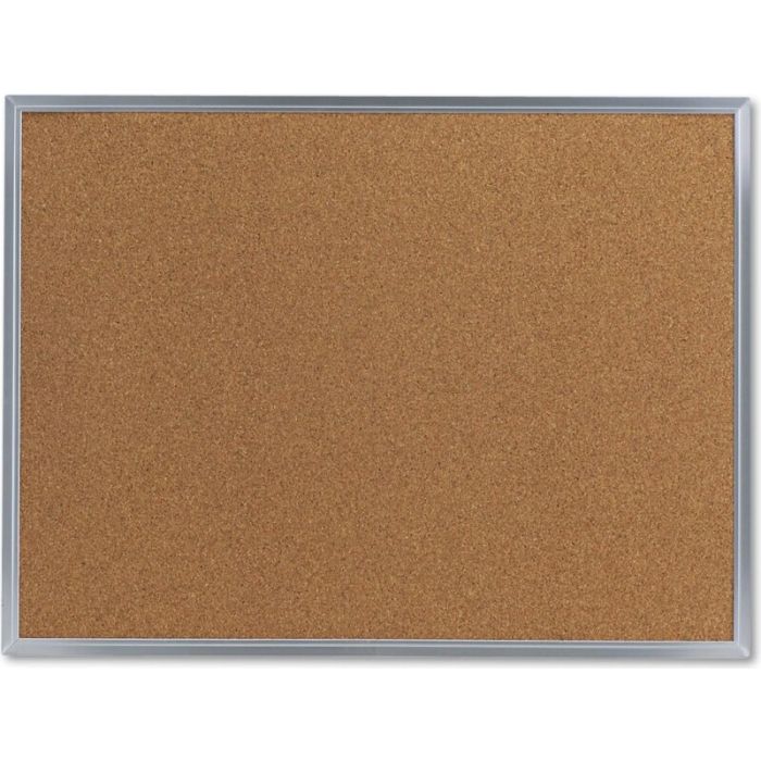 Resilient self-healing all-natural cork. Satin-finished, wrap-around aluminum frame. Dense fiberboard backing. Board Type: Bulletin; Board Width: 48"; Board Height: 36"; Surface Material: Cork.