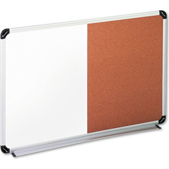 This combination board offers dual functionality with a dry-erase magnetic lacquered steel surface and a natural cork bulletin area for versatile use. Its satin-finished aluminium frame with plastic corner accents ensures durability and a professional look. Ideal for offices, classrooms, and meeting rooms requiring both writing and pinning surfaces.