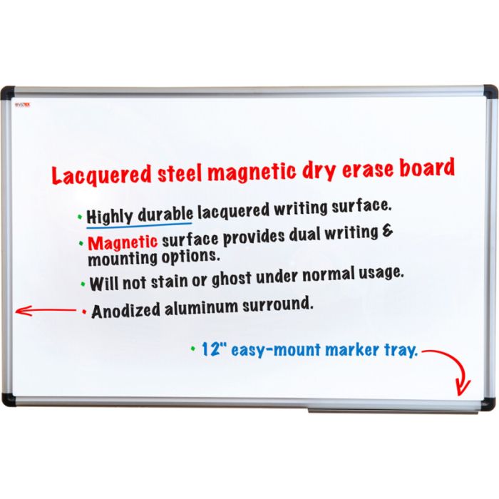 The Viztex® Lacquered Steel Magnetic Dry Erase Board offers a durable magnetic surface that resists scratches and stains while allowing easy writing and erasing. It features a ceramic white finish for clear visibility and includes a 12” marker tray for convenience. Ideal for offices, classrooms, and corridors where versatile display and presentation are needed.